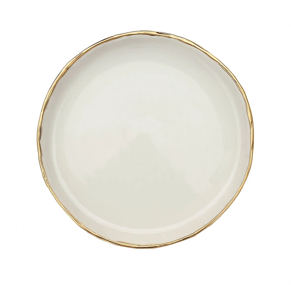 Handcast porcelain dinnerware featuring a decayed finish along the edge of every piece, highlighted with 22k yellow or white gold. Fully glazed inside with a matte exterior. Handwash recommended. No microwave.