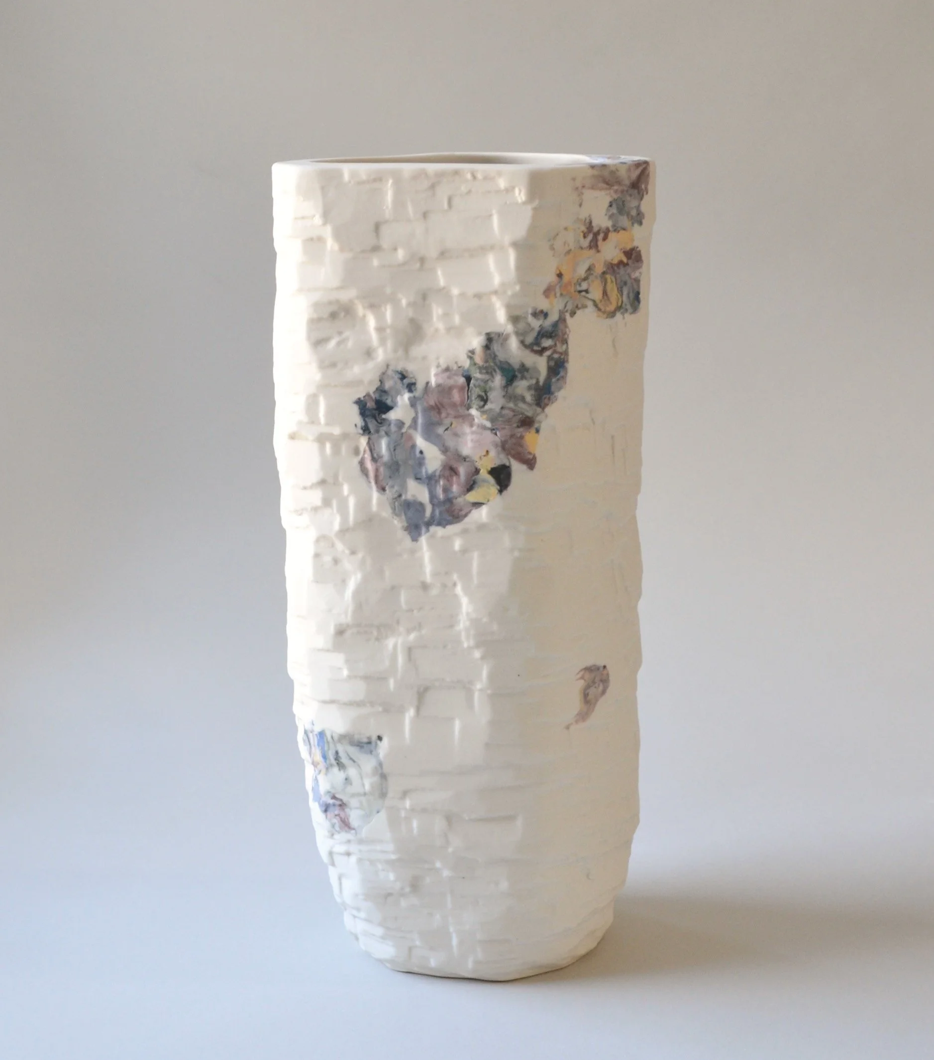 Cast porcelain vase with colored porcelain “scrap” inlay throughout exterior. Unique and textured surface. 10” H, 2” D